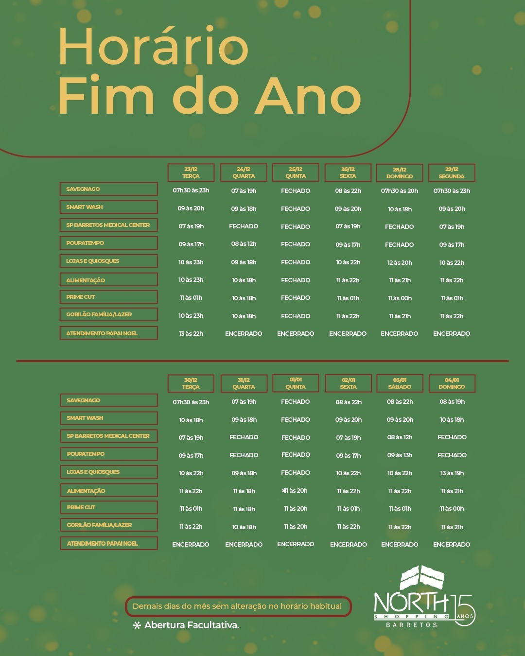 Para garantir que todos consigam realizar suas compras com tranquilidade, o shopping operará em horários diferenciados nas vésperas e feriados. Confira: